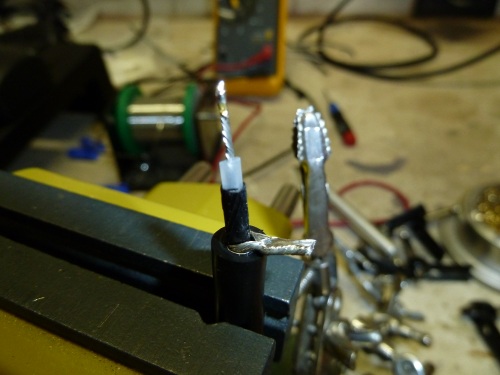 Now to make up the DC cables. Take one reel of 1-core shielded cable and a bag of plugs. I'm only putting the pedal ends on for now, the PSU ends will be done last. Tools for the job: