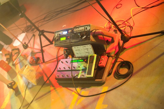 The orange pedal is simply a kill switch, so I can plug in guitars without making the band/audience painfully aware. It also has a momentary switch (red) if I want to abruptly stop then start the signal.