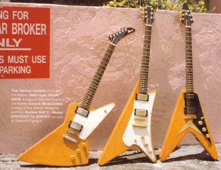 Gibson made several other runs of the Moderne in later years; these later ones were mahogany without the long tenon neck. I've seen them in natural brown, black, and white. They had contemporary type pickups and there was even a metal version with high output pickups, crazystripe paint jobs and the Floyd Rose trem. Many of these later Gibsons also had different headstock shapes like the arrowhead or reverse-v; all of the Heritage models have the asymmetrical "Gumby" headstock with the little pulleys.