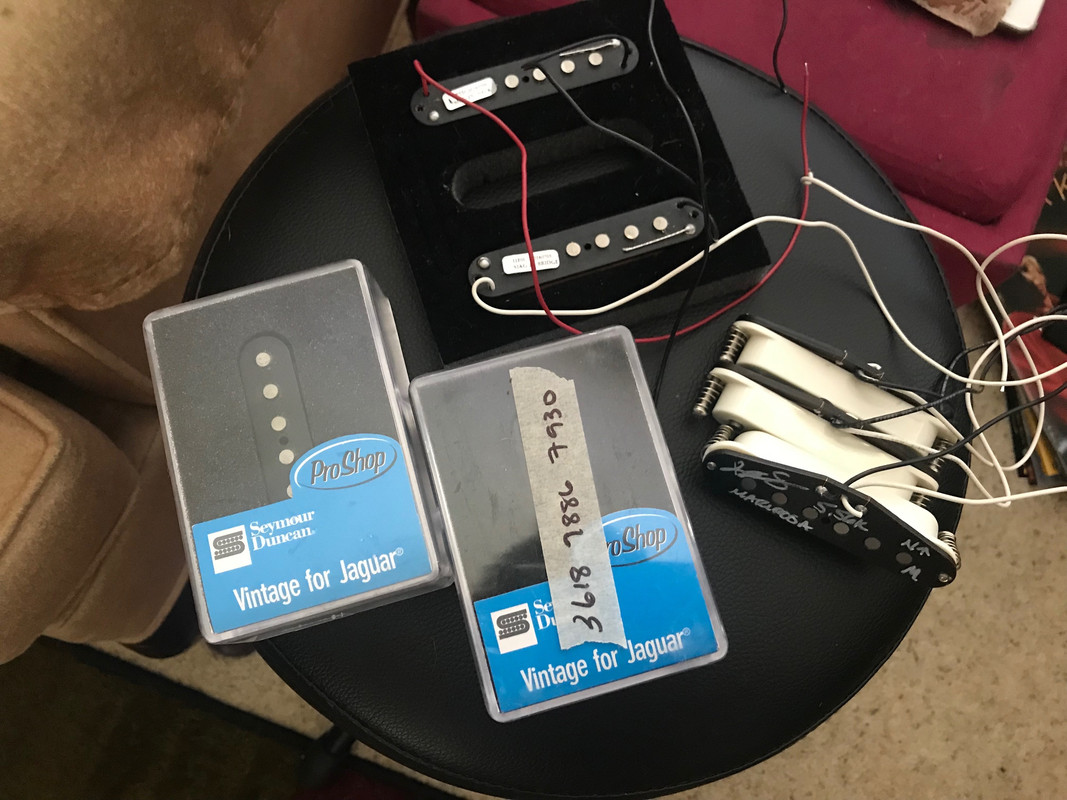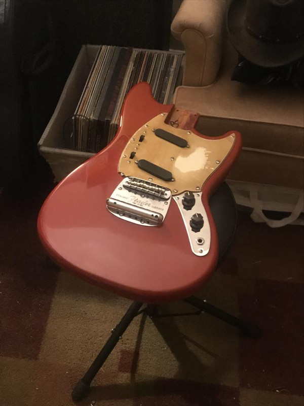 Anyway at about this point I realized I had a shoebox full of 99% of what I'd need to make a new Mustang: '64 vibrato, MIJ bridge, Duncan pickups, vintage pick guard...