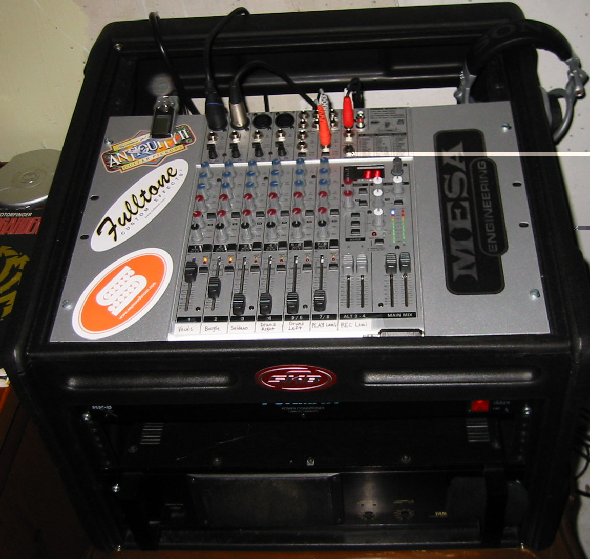 Here's a shot of my PA consisting of a Yamaha P2250C stereo power amp, Behringer UB1204FX mixer, and a Furman RP-8 power conditioner...