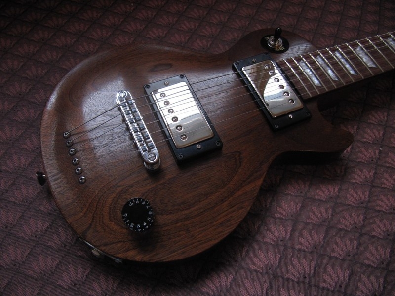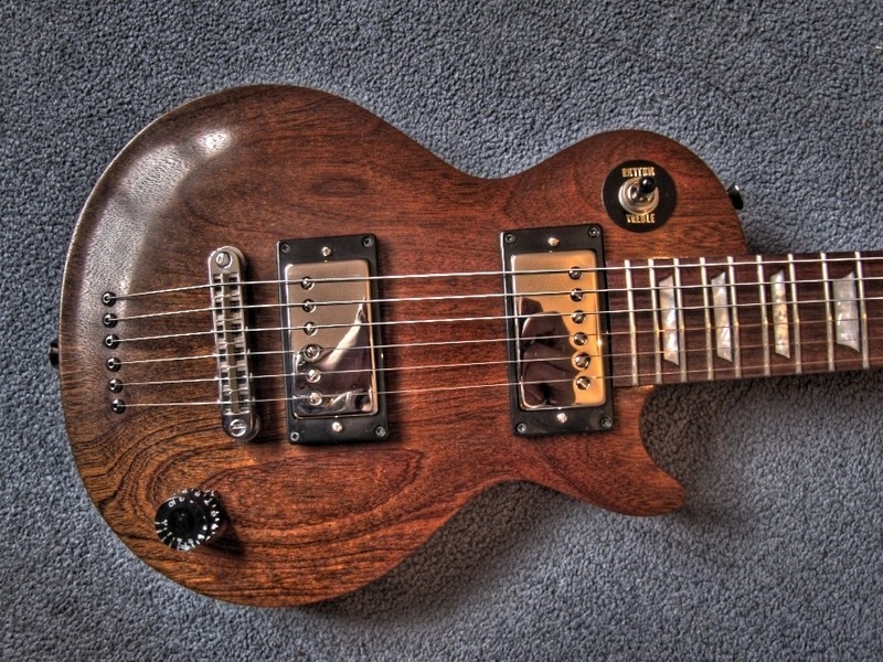 Pickups are the awesome dimarzio 36th pafs, chrome covered. Tuners are hipshot open gear locking which work and look great. I originally installed grover minis, but was not happy with them, so I changed them immediately with these. Has only volume pot and a standard LP switch. Bridge is gotoh TOM and there's no tailpiece, instead it uses string through mounting. The neck is three piece for added stability and shaped like 60s LP. Fingerboard is rosewood with trapezoid inlays and gibson-sized frets.