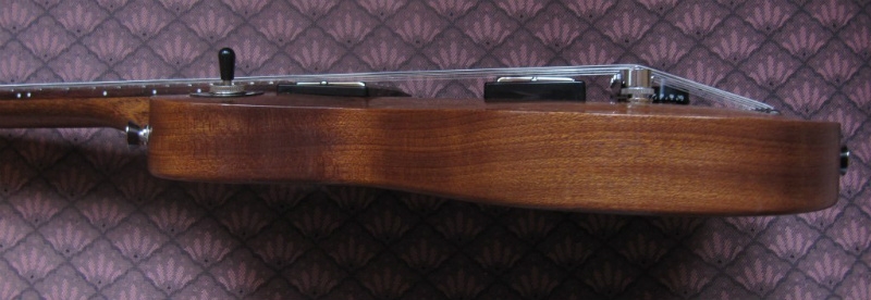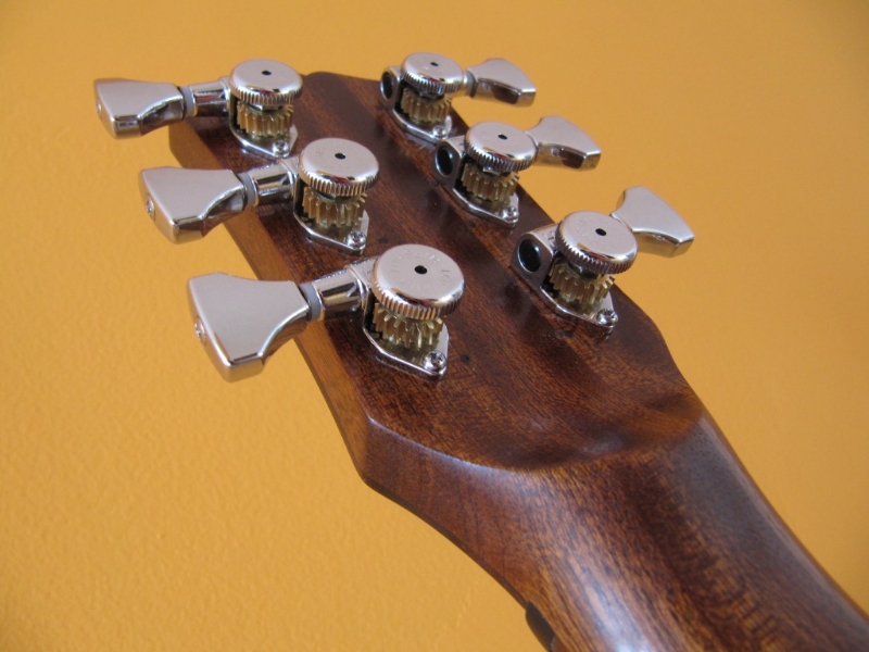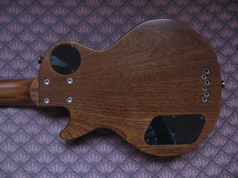 As far as specs go, it's an all-mahogany with full scale (24 3/4") but reduced size body and headstock. I wanted to keep the playability and feel of the full sized LP, but make it portable. Neck is bolt-on, but uses threaded brass blocks and allen screws to avoid any damage in case it needs to be assembled and disassembled many times. You can tighten it down without the risk of damaging wood. It's super easy to pack for travel when neck is removed, it fits into a carry on bag easily and is very light (I can weigh it if needed). All-mahogany construction makes for a bit warmer sounding guitar than having a maple cap.