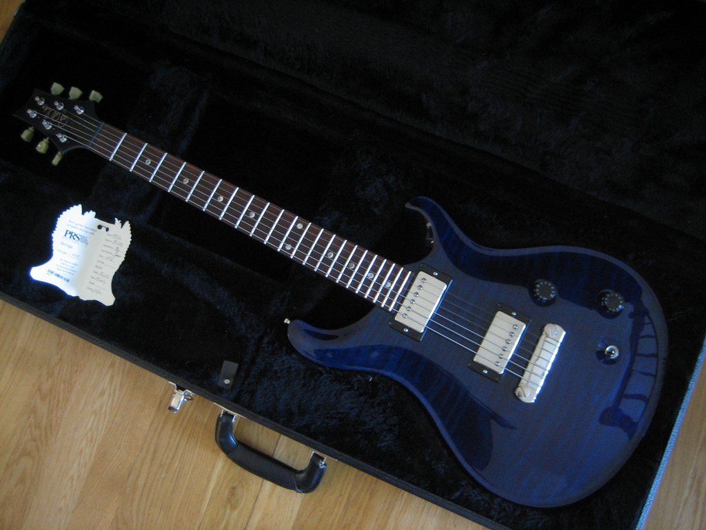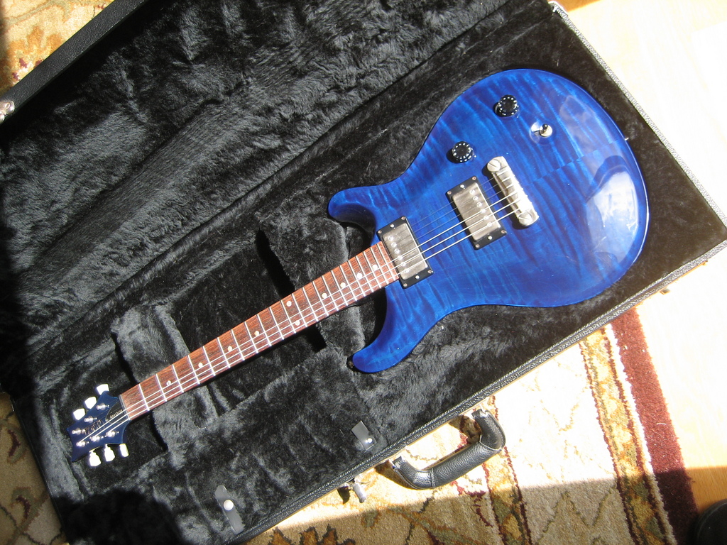 A 2000 McCarty maple top hardtail, dark blue with chrome hardware.