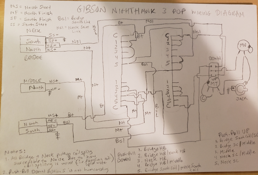 Oops, one minor correction to my pencil-and-paper sketch: i drew the Neck pickup oriented so that its South coil is the outer coil and the North coil is the inner coil. As you can see in the Gibson-issued diagram, the Neck pickup is oriented reverse of that. However, this is only an orientation difference. All of the wiring connections in my sketch are accurate as depicted; none need to be changed.