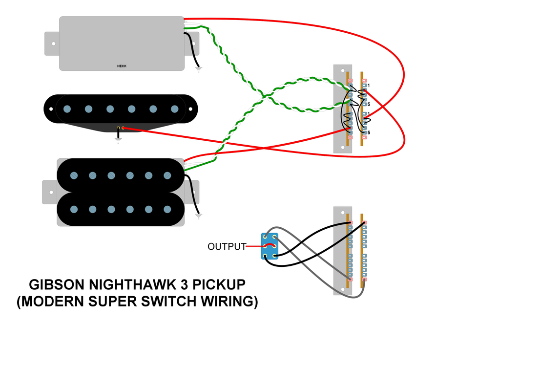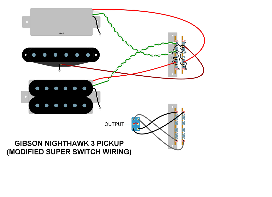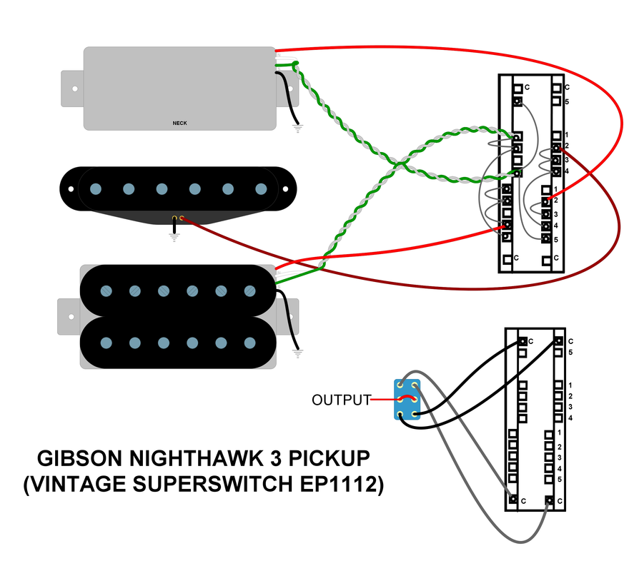 I noticed my '96 Gibson Nighthawk didn't sound quite right, and after a quick screwdriver tap test I found the neck pickup was shorting and activating in the bridge position (position 1 tone knob down) causing a muddy tone. I ordered a new fender SuperSwitch which feels 10x better than the 25 year old switch (along with a new Seymour Duncan bridge pup), but unfortunately I have gone through 4 attempts at wiring it with no success. At this point I am tempted to just go with a standard 5 way switch with basic coil splits, but I really love the "tele" position of the nighthawk in position 5 (tone knob down).