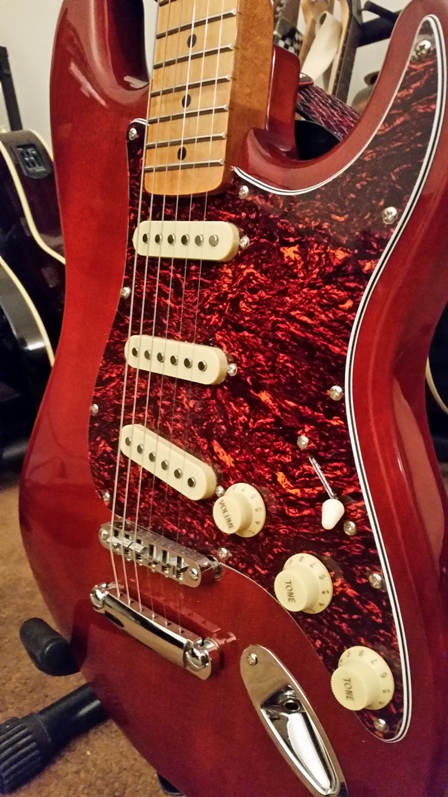 I have a bunch of other strats (HSS, SSS, and quasi-TSS), and decided to use this one to fill a niche sound. I'll be installing a Lace Blue/Silver/Red set into this guitar. Before I order, I need to decide what color pickguard to go with.