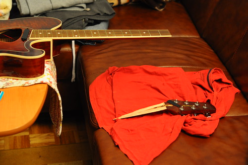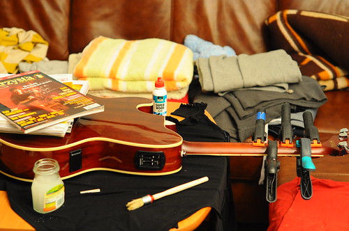 My work bench is my dining room table. Had to do this at night to decrease the risk of a child wandering about. Guitar magazines helped serve as counterweights.