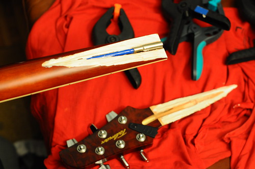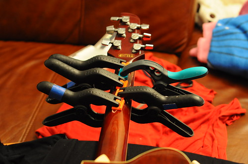 Putting the two pieces together I used the original nut to check the spacing/placement of the neck. I had two of these clamps lying around and bought 3 more for a buck a piece. I read online about someone suggesting these as they add enough pressure while c-clamps are usually over screwed by amateurs (?)