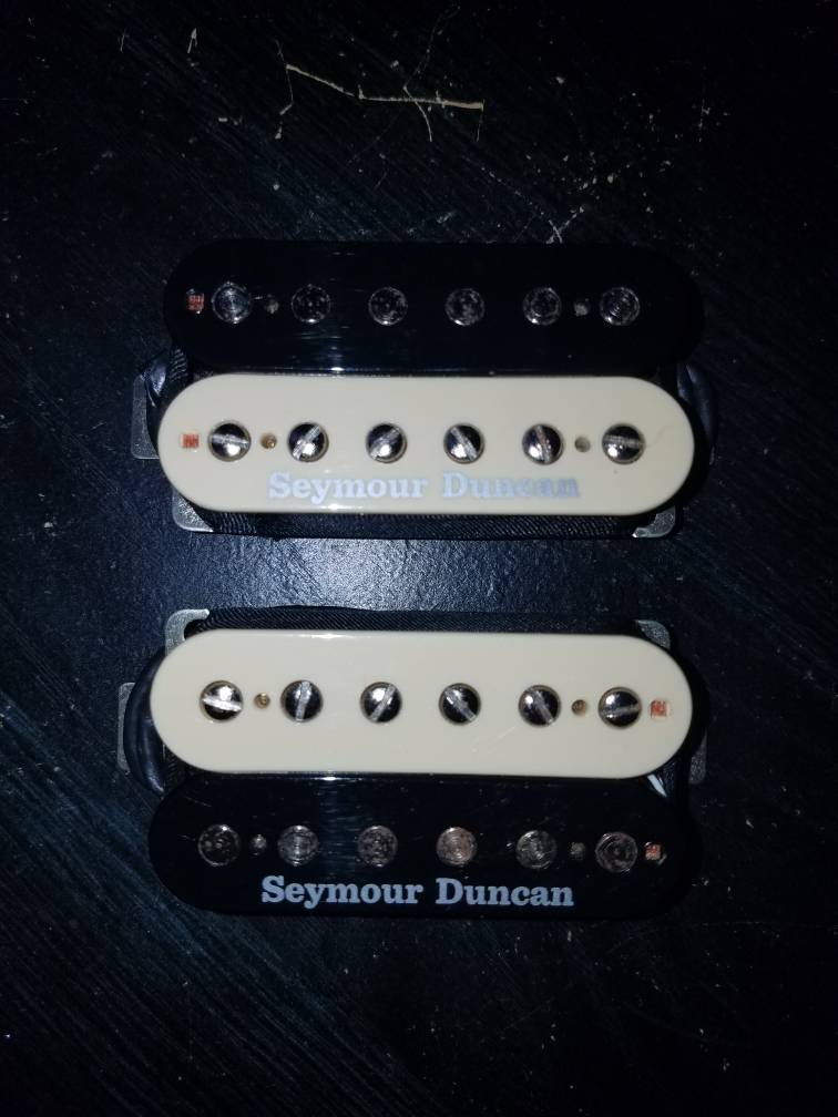 Black and cream zebra colored. Has some playing wear, 10 inches of lead wire. One has a soldering iron burn bout 4 inches from pickup on the lead wire. Has a little bit of pitting on flat poles. CONUS only.