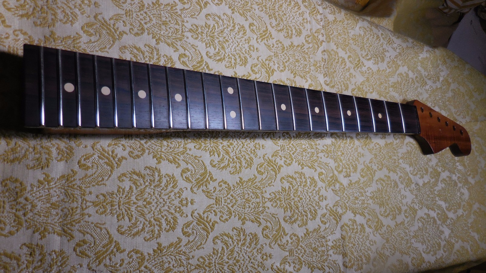 Excellent +. Neck Straight, Truss Rod Works. Frets in fine condition. Neck is clean and Warmoth Factory thin Poly Finish is outstanding*.There are some tiny indentions on the back of the headstock at the tuner holes- not certain why they are there or what for.