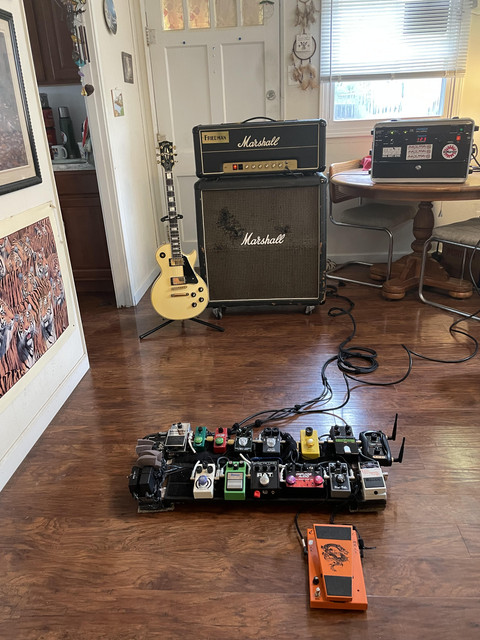 My current Church board, In the front a Boss CS-3 compressor and a Wampler Belle OD, In the loop Buffer, DD7 Boss Delay and a Neunaber Seriphim verb.