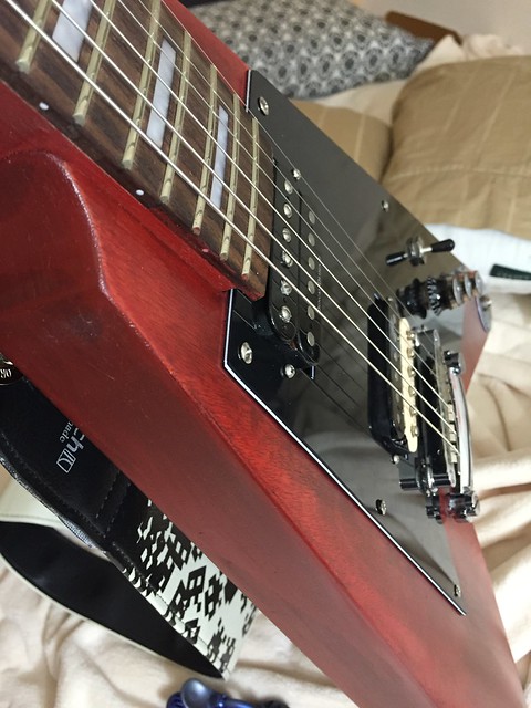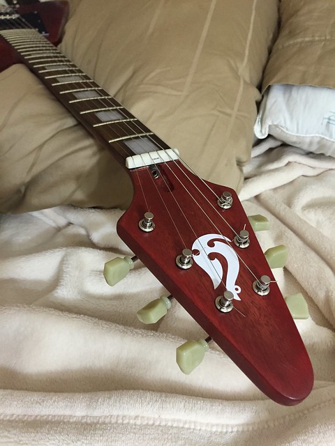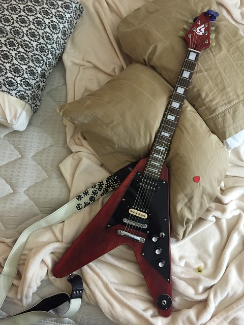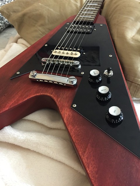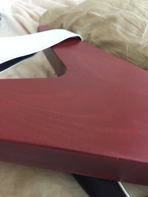 I am finished with my first build. Its a relic’d faded trans cherry reverse burst Flying V-style guitar. It was a fun experience and the guitar looks and sounds great. Some intimate bedroom pics: