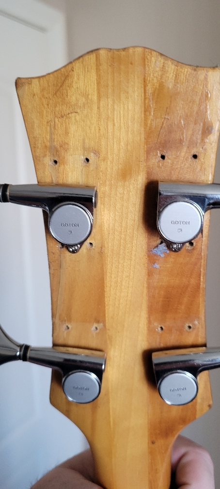 This was the most frustrating project. I have worked on. Something went wrong at every step of the way. Parts were really hard to find. The neck plate has a non standard bolt pattern but luckily someone was selling one on ebay for 20 bucks. Bought a knock off hofner tailpiece and bridge off Amazon as well as 500k pots, orange drop caps,tusq nut, a jack, and toggle switch. All I needed was tuners... I ran into the first major issue, no aftermarket tuners would fit in the less than 1/2" hole so I went with some gotoh tuners that fit in a 9/16" hole and decided to drill.