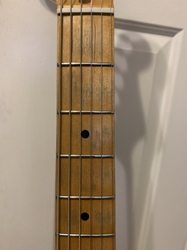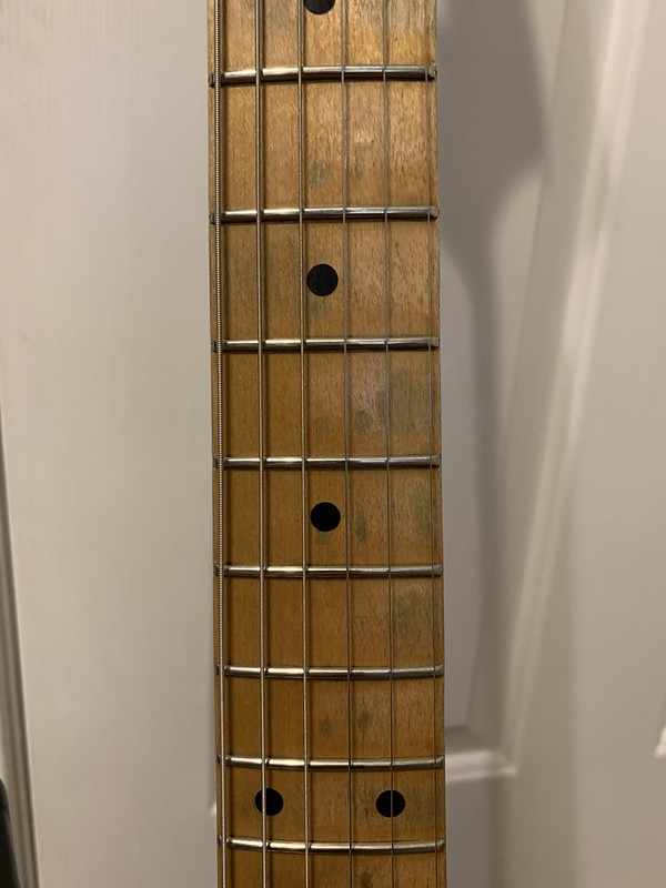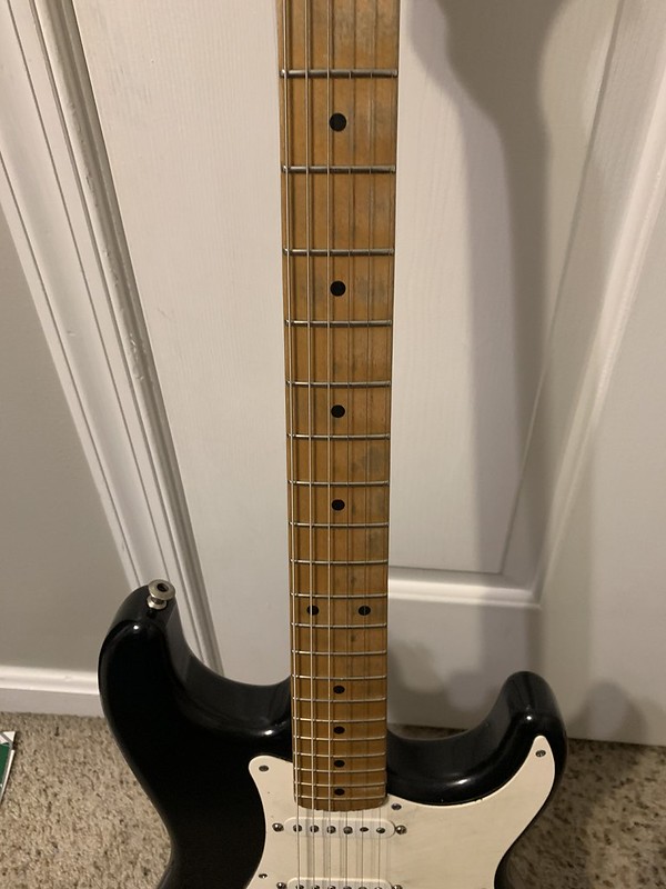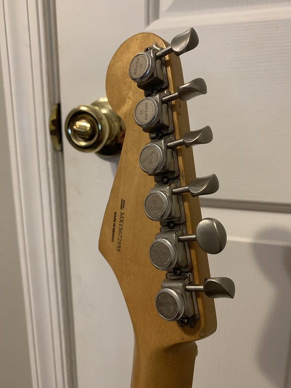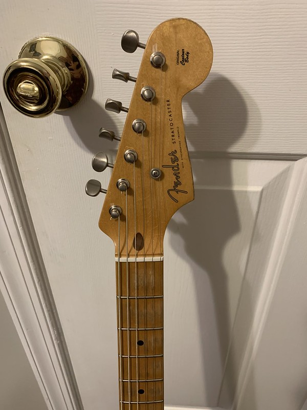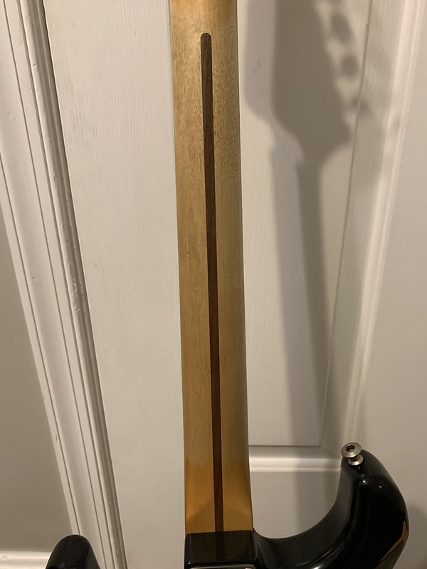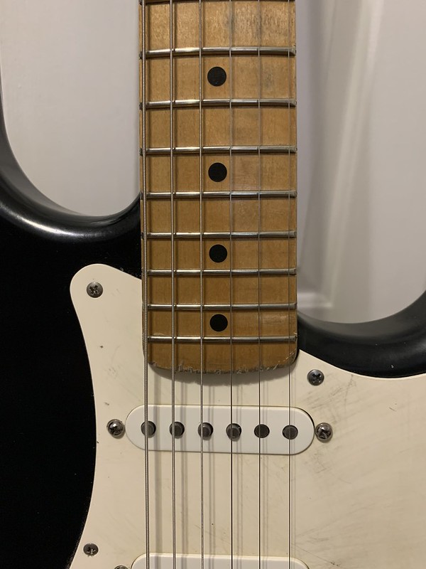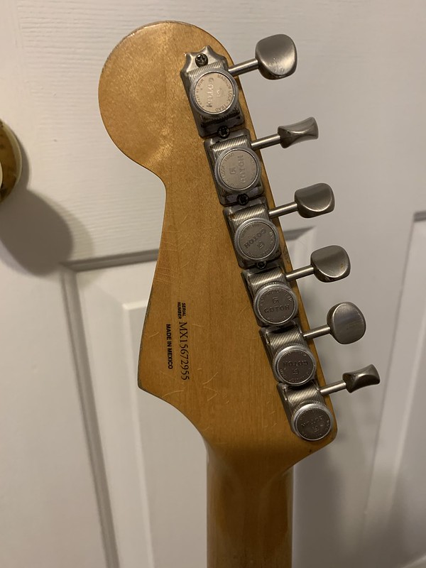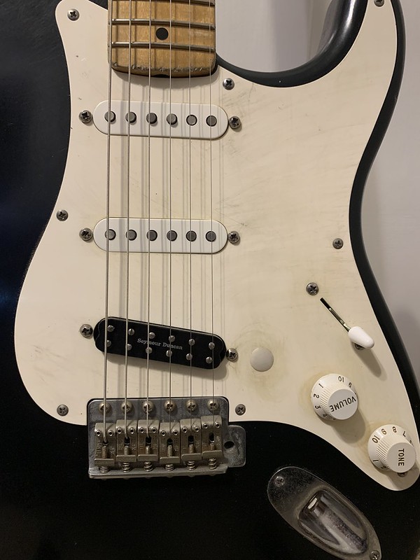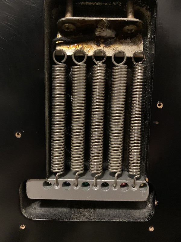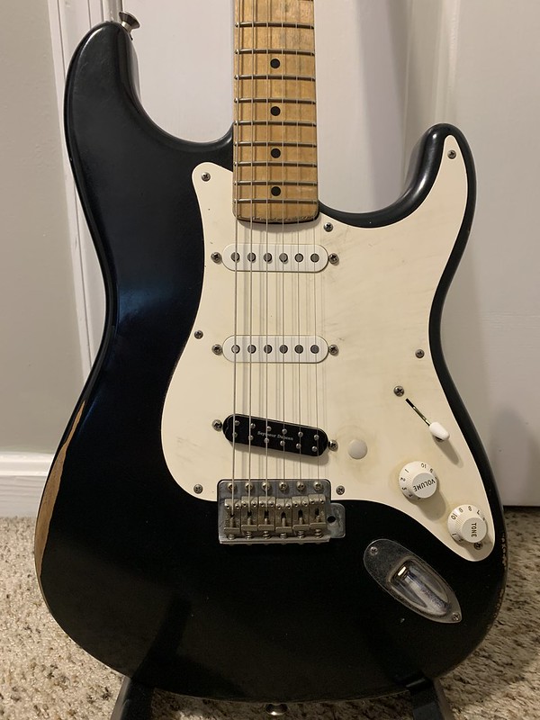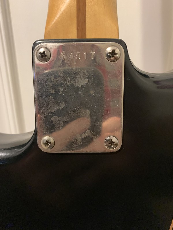Picked up a super cool black 2015 Road Worn Stratocaster...previous owner had shielded the electronics cavity, upgraded the pickups (Seymour Duncan APS1 & 2 in the neck/middle and Porter vintage custom in the bridge), replaced the neck plate with a 5 digit numbered one (which would correspond to 1961, so either the number had some personal significance or it was just a random number), and even replaced the butterfly string tree with a proper 50's round one). Bridge was already decked and all 5 springs were on it, exactly as I set my strats.