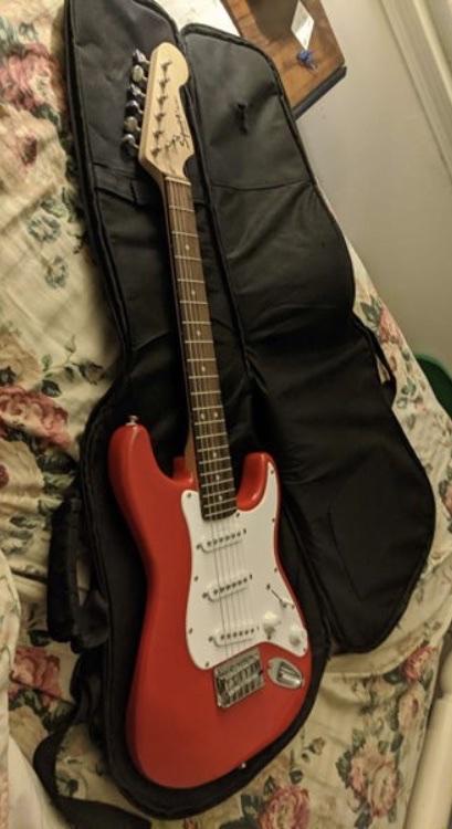 My grandson will turn 7 next month. Every time he comes over our house he wants to play my guitars. They are too big for him but he sits down and I put on his lap and he strums away at it. I found this Squier mini Strat that’s basically a smaller version of his favorite red Strat of mine that he always wants to hold.