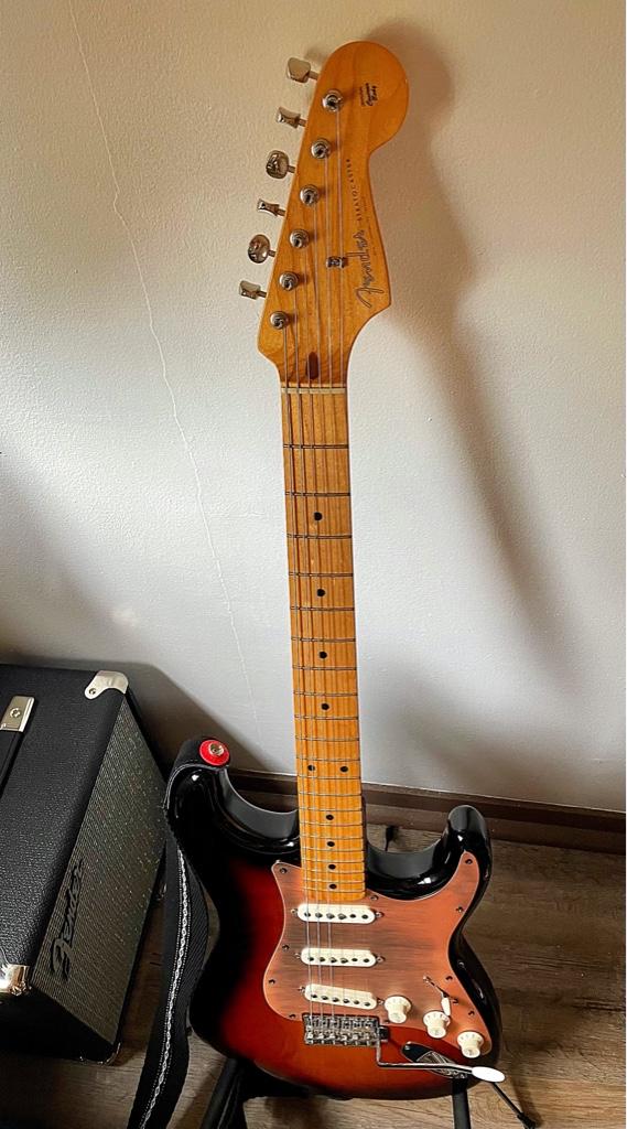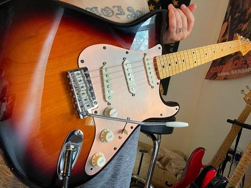 New sunburst Fender body from reverb, electronics from a 2002 MIM Strat, plus a Dimarzio Virtual Solo pickup in the bridge position, with a (red copper colored) aluminum pickguard from eBay.