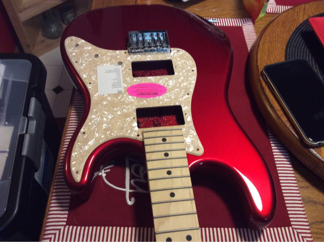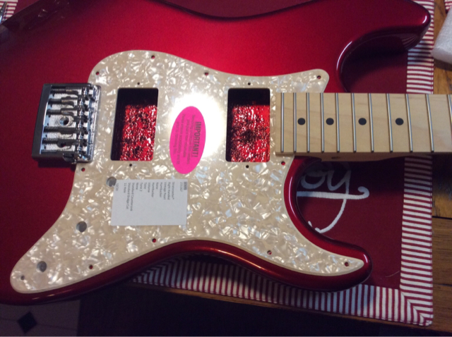 The neck and body are from Warmoth. The body is an alder Strat shape in candy red and is routed H-S-H. I'm using a Schaller 475 bridge for the first time. I'm wanting to use two humbuckers (still trying to decide on which ones) with MV and MT on a three way switch and a push - pull for series / parallel.