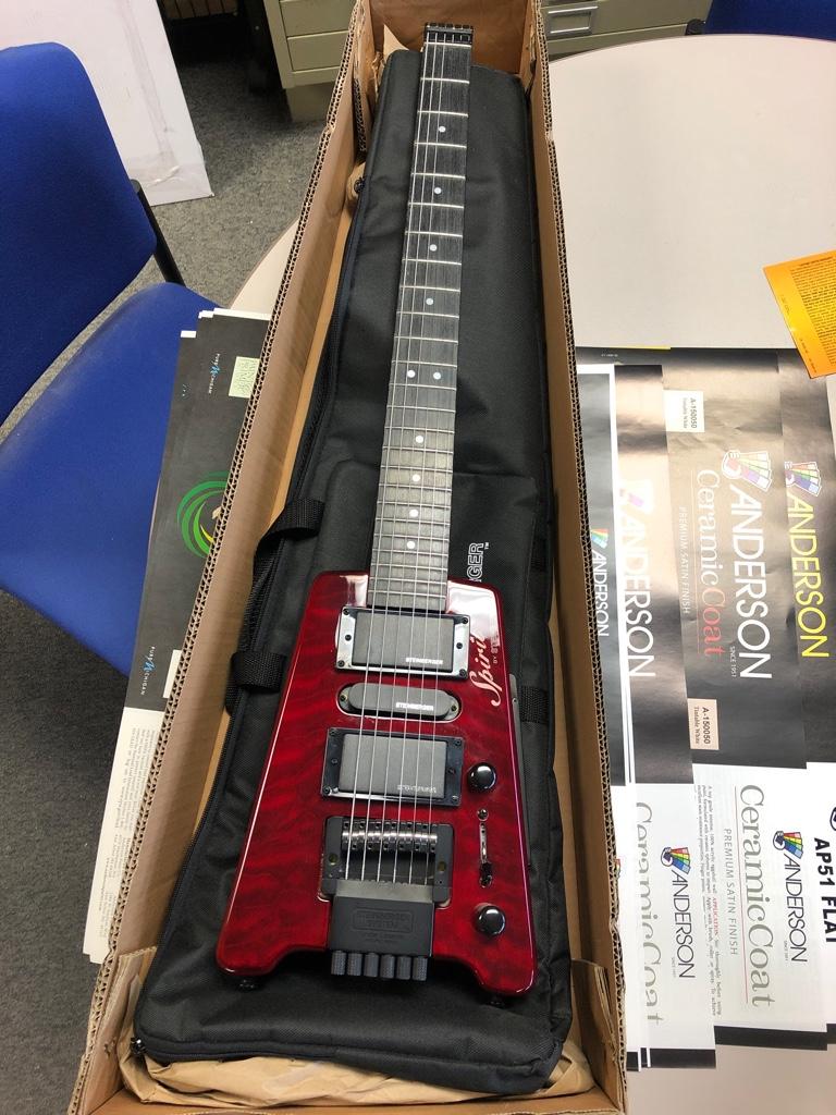 I remember back in the 80s being captivated by the whole Steinberger headless thing, and ever since I’ve had a secret desire for one, even though everything I see says they’re not the same as they used to be. But when I found a pretty rockin’ price at zZounds I succumbed to temptation and ordered myself a Spirit GT-PRO Quilt Top: