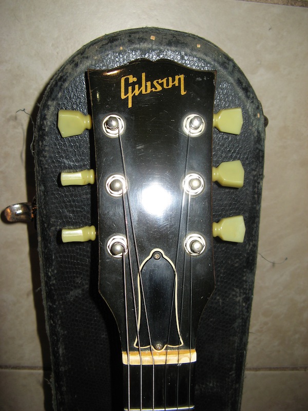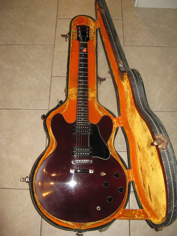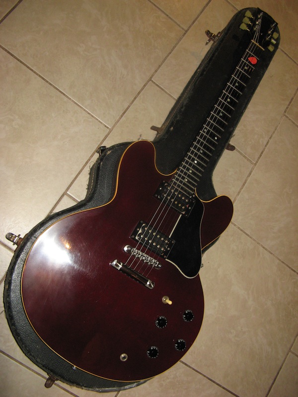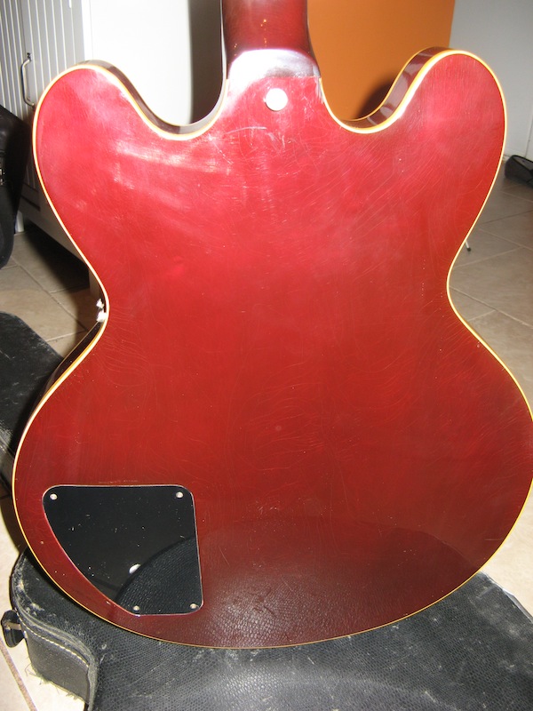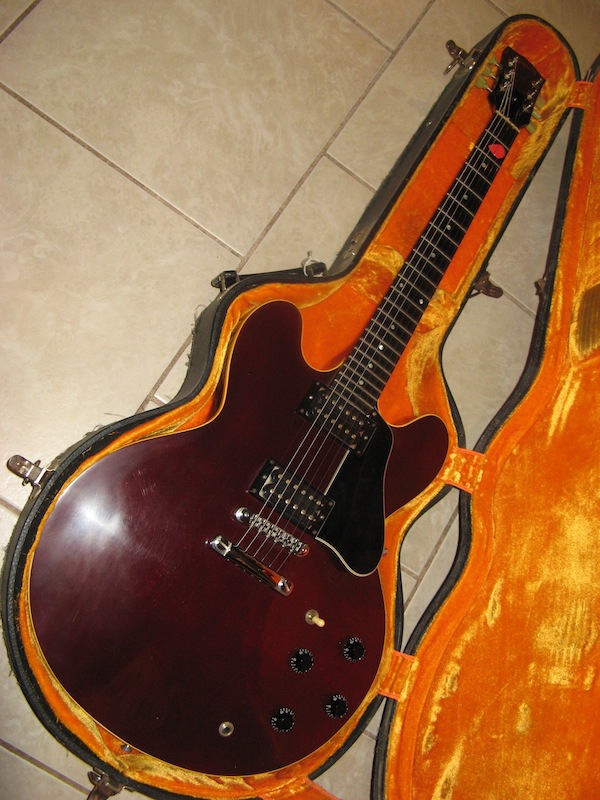 The case came with it. Apparently from 1968. Latches all work. Looks beat up but generally good, except for some tape at the bottom edges. The liner is shedding, which looks bad on this colour of guitar. The case also looks like it was made for a deeper-bodied guitar as the 335's neck touches before the back.