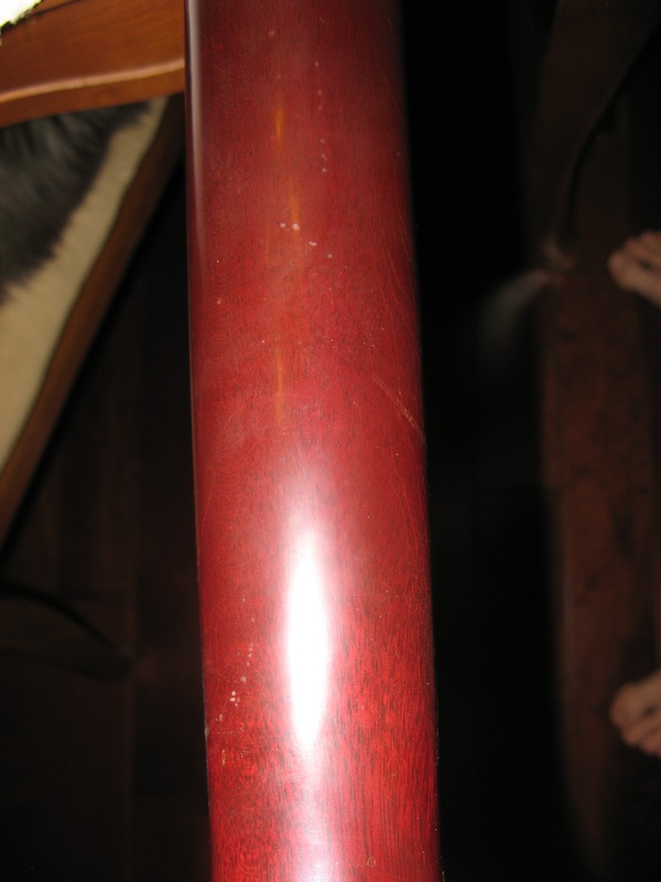 There is checking on the finish - both front and back. You can really see it in the photo of the back. It's actually hard to photograph. Depending on the angle sometimes you can see through the paint. It's translucent but you have to find the angle. With daylight coming through the window this afternoon I didn't even see it, but tonight with just the room lights I can make out the mahogany neck, and the maple of the body. The photos actually show pretty well - better than I could see in person. The flash hit just right for these photos. Other photos I took are actually very dark. Photos with the flash were sometimes darker than without.