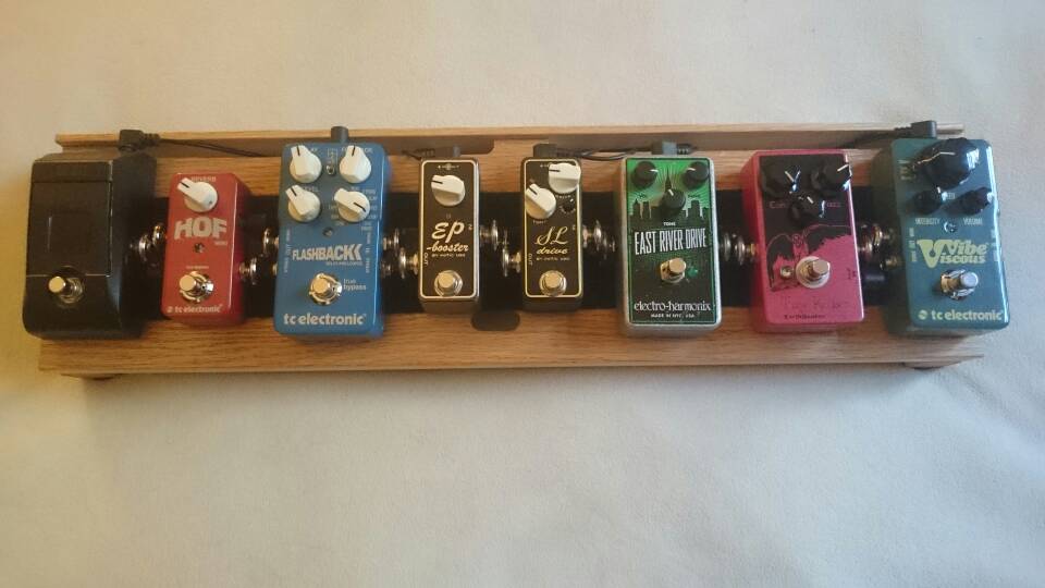I finally have my board back in one piece. I had pedals all over the place due to grabbing onesies and twosies off the board for different gigs. Now that the band is practicing at my place I can use the big board again and not worry about lugging it around.