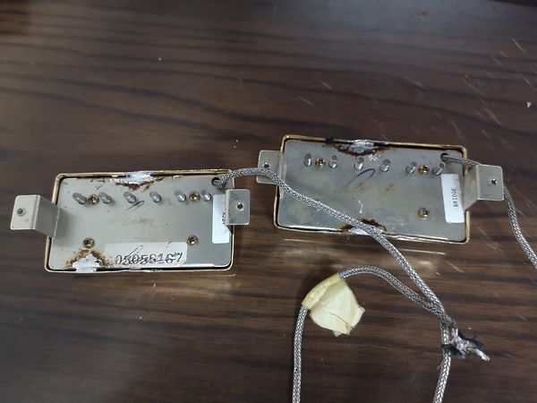These are original Seth Lover humbucker set, where you can easily read "Seymour Duncan" and "Seth Lover" signature. The labels also are different (not only Neck o Bridge)