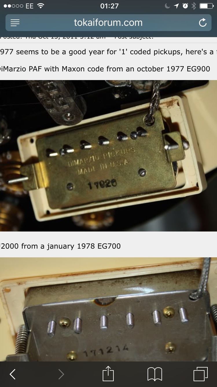 My own pickups were incorrectly ID'd as DMZ by 2 luthiers. I have contacted DiMarzio and the helpful guys at Japan Axe to get a proper ID on what mine are - which are clones of DMZ super 2 made by Maxon on production line 2 in July 1979 - super 80s using the DMZ super 2 format even got the early 70s single core hookup and outer braid.